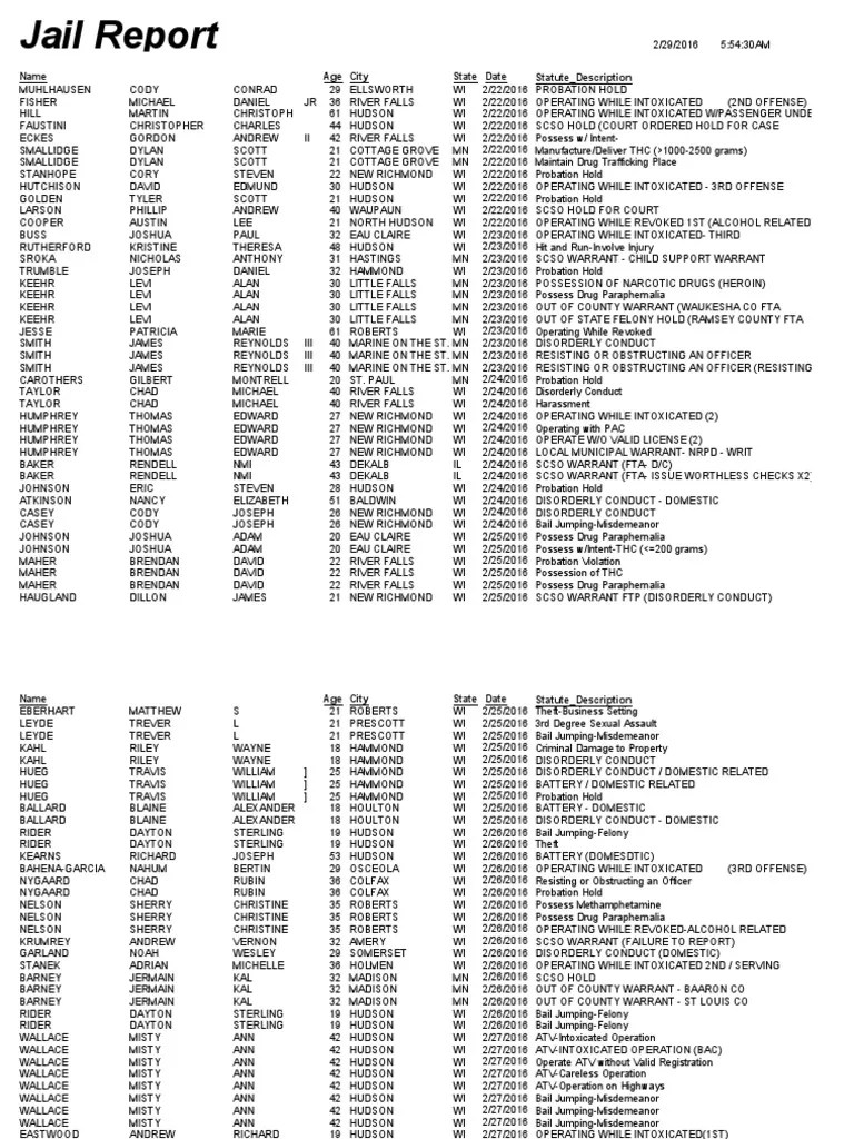 St. Croix County Jail Log Feb. 2228, 2016 Probation Violence